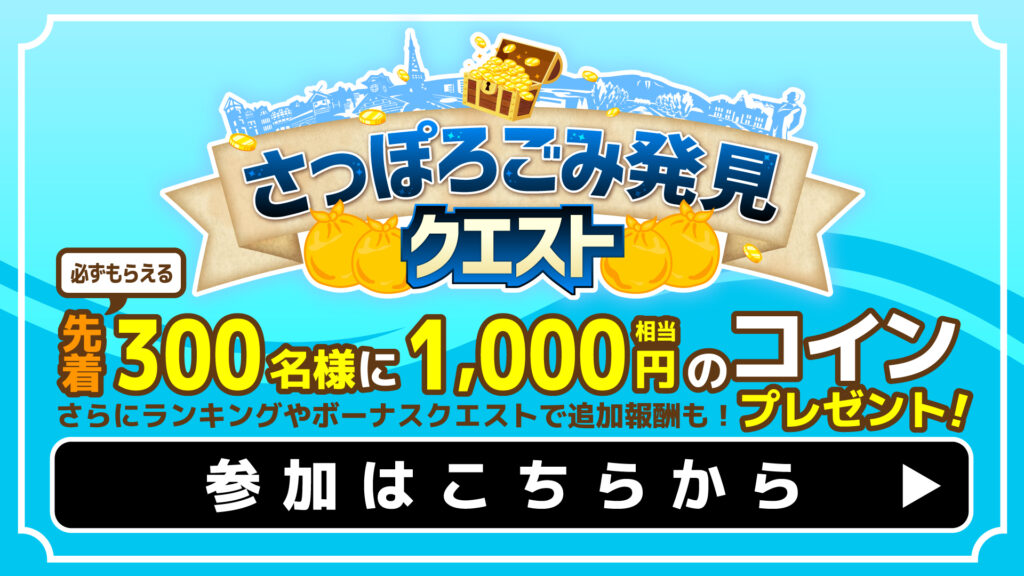 期間中に札幌市内のごみを発見して「さっぽろクエスト」アプリで投稿すると、飲食店で使える総額50万コインがGETできるイベントです。